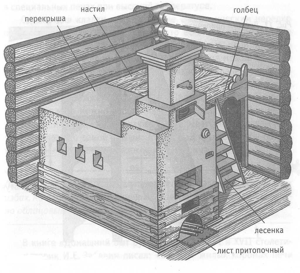 - лежанки, расположенной сзади дымохода над горнилом. Когда работает печь, она прогревается.