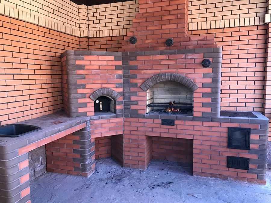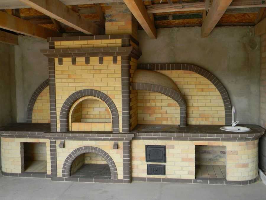 Печь с комбинированным сочетанием кирпичной кладки различных цветов, выглядит отлично. В конструкции дополнительно встроена раковина.