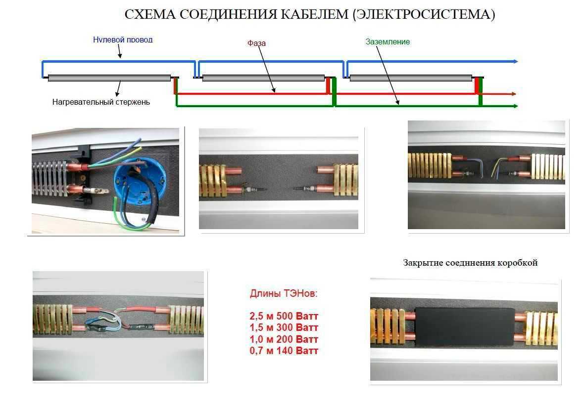 В итоге на одном тэне с каждой из сторон, если это не конечный или начальный модуль, будет по два провода. Фаза пришла с одного кабеля – фаза ушла дальше. Ноль пришел – ноль ушел.