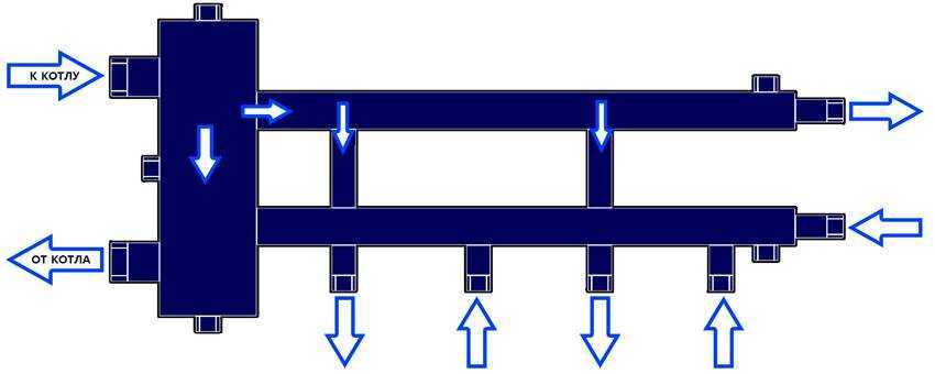 Теплоноситель поступает из котла в «стрелку», движется по ней в горизонтальном направлении и переходит в коллектор лучевой разводки, распределяясь по множеству контуров системы отопления. Причем каждый напорный патрубок на «выходе» из стрелки-коллектора комплектуется своим насосом, обеспечивающим циркуляцию теплоносителя в конкретном контуре разводки.
