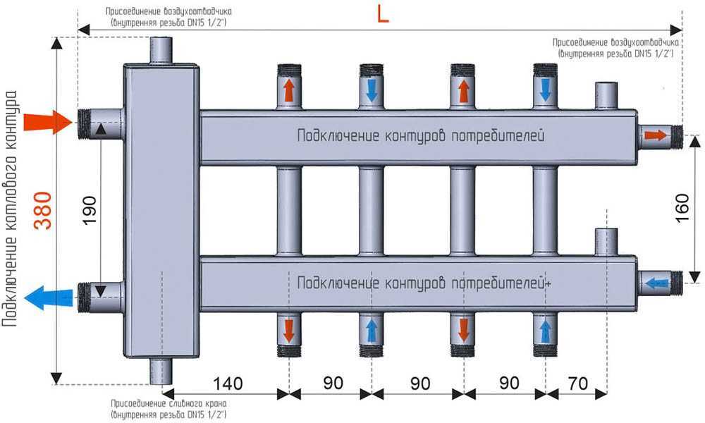 Гидравлическая стрелка, к которой планируется подключать более 3 контуров нагрева, как правило, изготавливается вместе с коллекторами — подающим и обратным. Распределитель устанавливается таким образом, чтобы выровнять давление между ними.