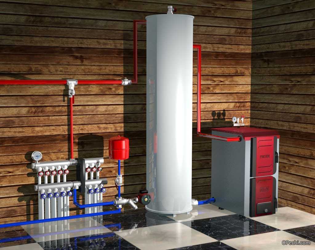 Буферный бак для отопления (он же теплоаккумулятор) работает в двух режимах – накопление и отдача. При этом мощность котла может превышать необходимую тепловую мощность для обогрева жилища. Пока в топке будут гореть дрова, будет происходить накопление тепла в термоаккумуляторе. После того как поленья потухнут, энергия еще долго будет забираться из аккумулятора.