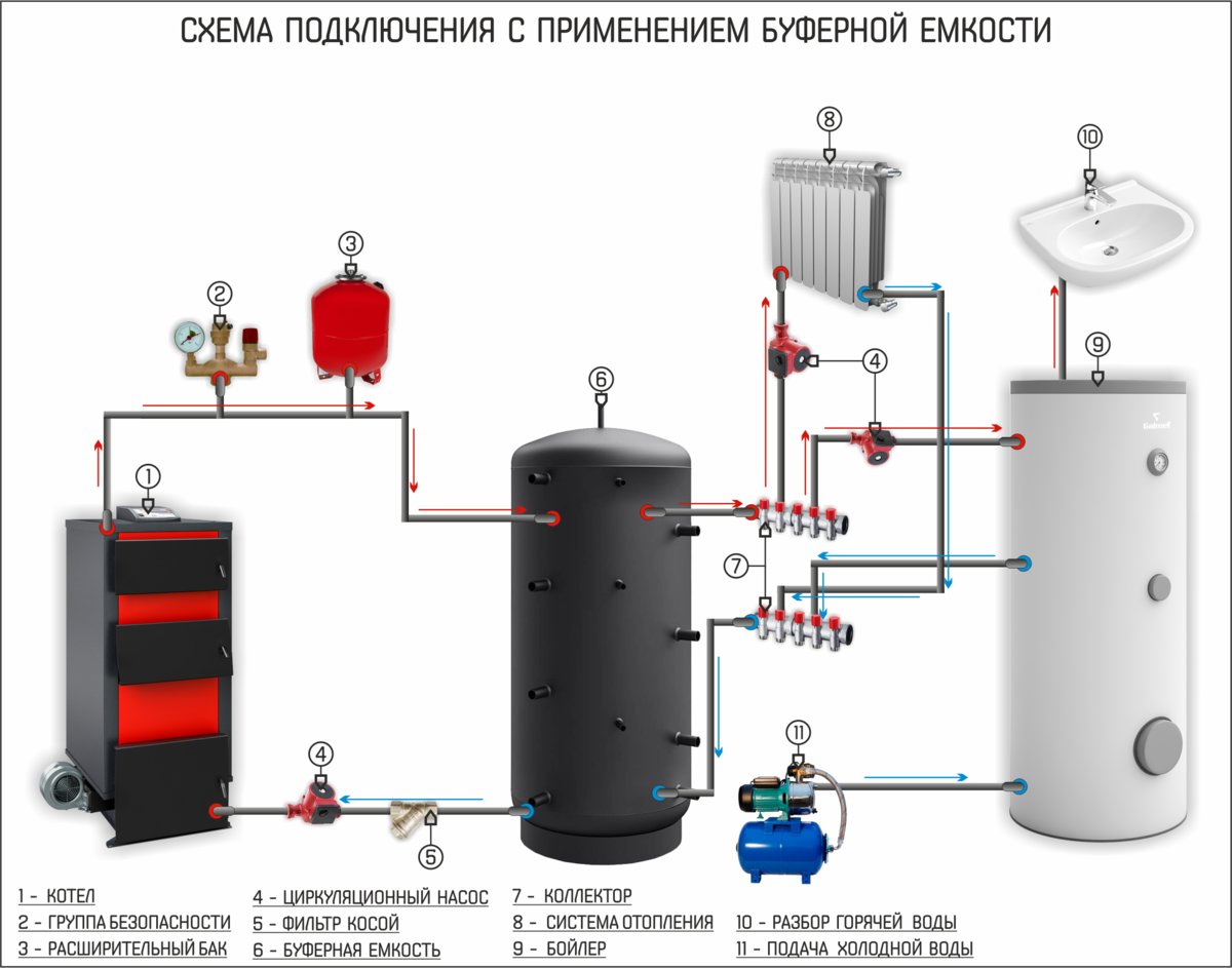 Способов обвязки котла твердотопливного с теплоаккумулятором и системой отопления существует немало. Но все они производные от базовой схемы, изображенной ниже. С ее помощью легко разобраться, как эти агрегаты работают в паре, а после все смонтировать своими руками.