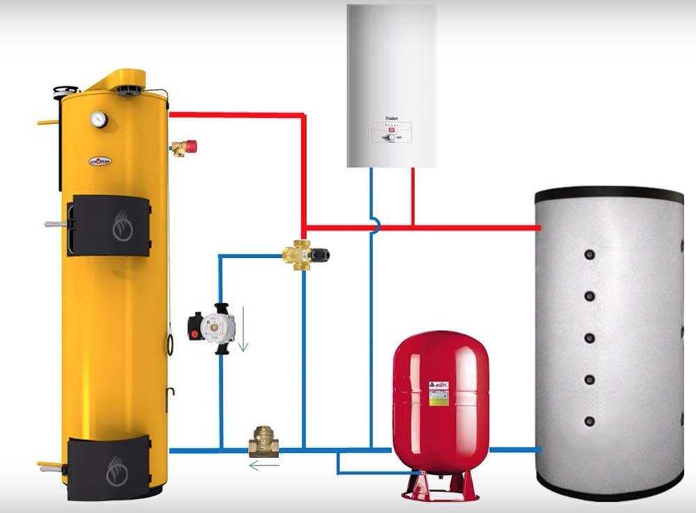 Чтобы рассчитать идеальную схему отопления, нужно как можно лучше совместить работу твердотопливного агрегата с баком аккумуляции тепловой энергии. Дело в том, что рабочая температура водоподогревающего устройства постоянно колеблется в районе 60⁰C-90⁰C и удержать её в постоянном режиме практически невозможно. Ведь котёл, работающий на дровах или угле – это инертное устройство, в отличие от аналогичных газовых, электрических и даже дизельных установок (схему подключения твердотопливного котла вы можете посмотреть в этом материале).