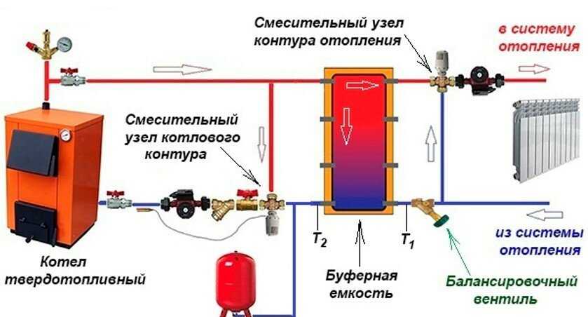 Источник тепла, работающий на твердом топливе, имеет традиционный котловой контур со смесительным узлом, чья задача – не допустить подачу холодного теплоносителя в котел. Затем подающий и обратный трубопроводы подключены к буферной емкости, соответственно, сверху и снизу. Таким же образом к теплоаккумулятору присоединяется система отопления, тоже оснащенная узлом смешивания. Его цель – поддерживать в системе требуемую температуру воды, подмешивая часть горячего теплоносителя при необходимости.