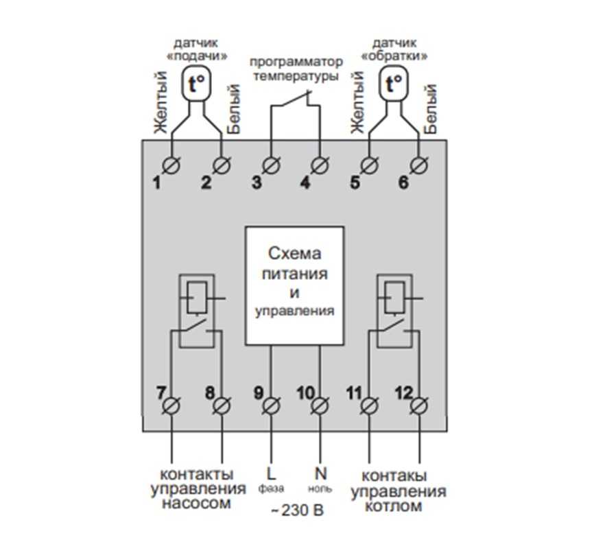 Как правильно подключить термостат BeeRT к котельному агрегату? В соответствии со схемой 1 питающее напряжение 230 Вольт, подают к клеммную колодку 9 (фаза L) и 10 (ноль N). От клеммников , осуществляется управление циркуляционной насосной установкой, а 11, 12 — нагревательными деталями (ТЭНами) котла. Датчики температурного режима жидкости подключают следующим способом: