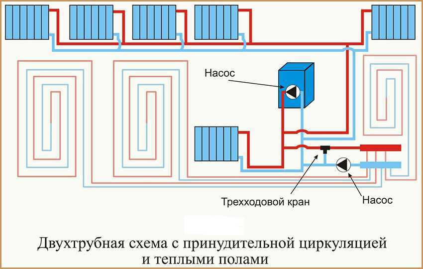 Двухтрубная система отопления дома с нижней разводкой — схемаСхема двухтрубной системы отопленияДвухтрубная система обеспечивает подачу теплоносителя к радиаторам без потери тепла. Ее разновидности показаны на фото. При параллельном подключении достигается экономия на материалах. При лучевом,