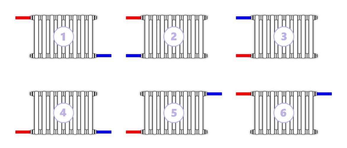 Данное диагональное подключение радиаторов реализуется следующим образом: вход тепла находится в верхнем отверстие, а пройдя все секции, выходит из противоположного отверстия снизу.