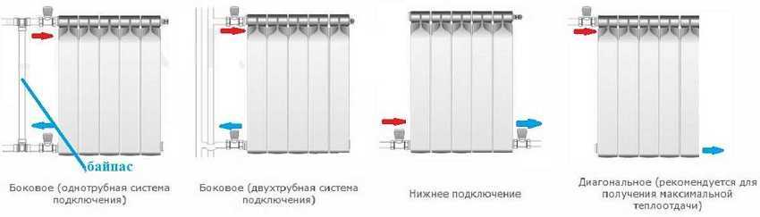 Наибольшее распространение получила односторонняя боковая схема, отличающая наибольшим показателем теплоотдачи. В этом случае трубу, подводящую теплоноситель, соединяют с верхним патрубком, а отводящую с нижним.