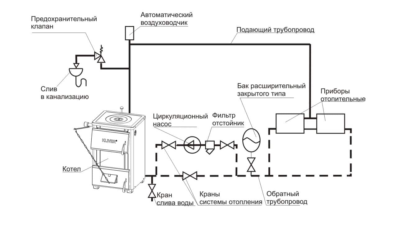 - Обратка. Излишек теплой воды поступает в расширительный резервуар, остывает и возвращается в котел.