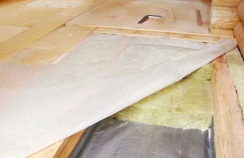 - Всю конструкцию накрывают паронепроницаемой пленкой таким образом, чтобы были закрыты и доски чернового пола и деревянные балки.