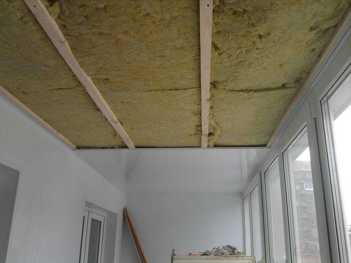 Монтаж теплоизоляции на потолок — важная и ответственная часть работ по утеплению балконного пространства. Именно туда поднимается тёплый воздух, где он охлаждается с образованием конденсата. Процесс монтажа подразумевает обустройство обрешётки, схожей с каркасом, закреплённым на стенах. В ячейки укладывают раскроенные листы ваты. Для более надёжной фиксации их промазывают соответствующим клеем и прибивают пластиковыми дюбелями. Поверх обрешётки крепят фольгированную пароизоляцию и облицовку.