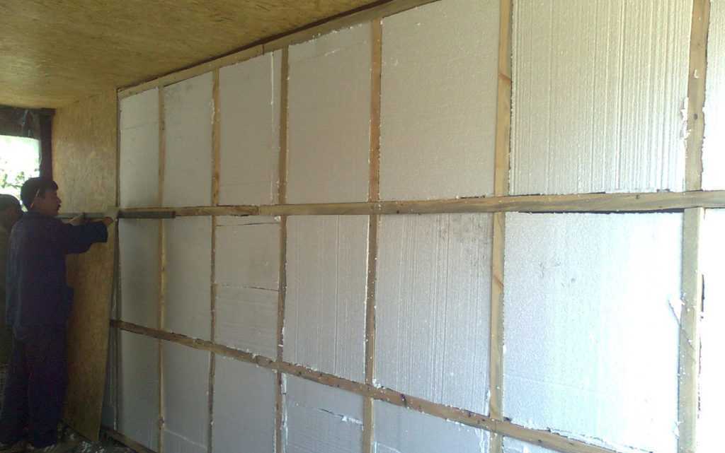 К современным утеплителям относится пенопласт, который фиксируется к металлическому профилю либо к деревянной обрешетке. Процесс, включает в себя следующие этапы: