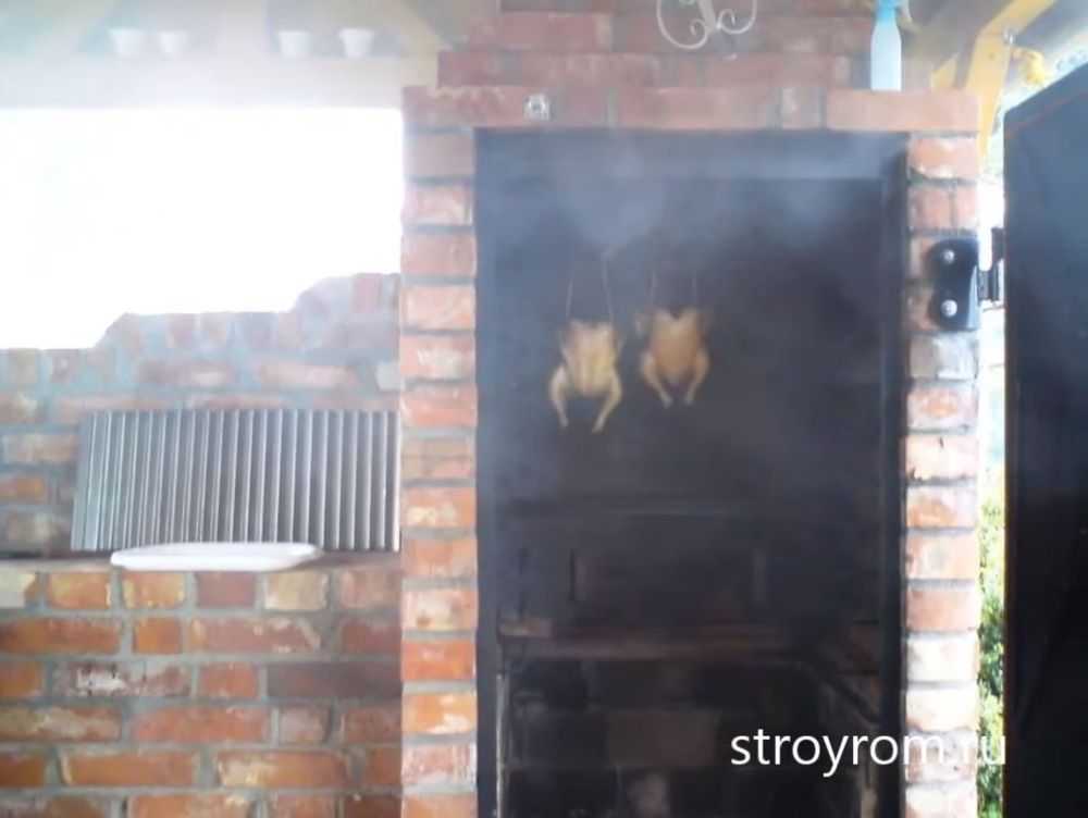 Коптильная камера обычно делается горячего метода. В некоторых моделях для обеспечения холодного метода копчения, дымовую трубу нужно вывести с жаровни. Для того чтобы отвести дым нужно построить дымоход с заслонкой и специальный свод над жаровней. Благодаря такому дымоходу, конструкция будет казаться массивной и необычной.