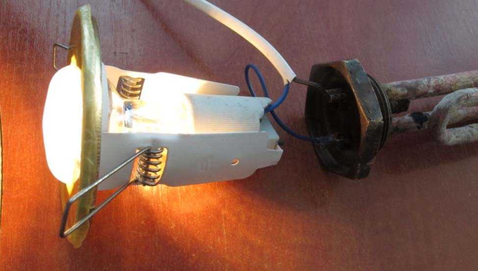 Проверить нагреватель на обрыв также можно с помощью контрольной лампы электрика. Если лампочка будет гореть, тогда обрыв отсутствует. Сделать подобную лампу можно из подручных материалов и у нас есть статья, как сделать контрольку своими руками. Это все способы проверки устройства.
