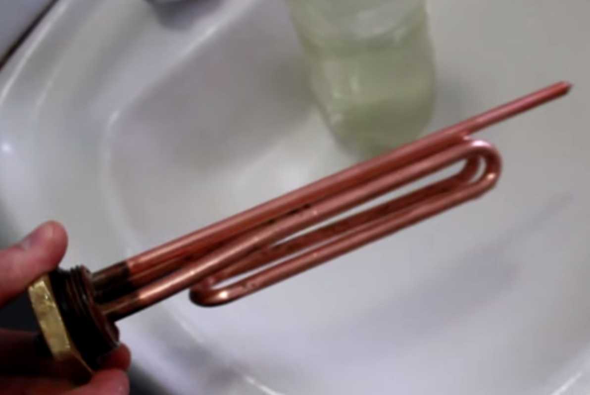 Во время извлечения ТЭНа выльется еще немного воды, которая осталась в резервуаре. Сам нагревательный элемент рекомендуется сразу же почистить, пока он мокрый и отложения накипи не отвердели. Для чистки рекомендуем использовать специальные средства, которые можно разбрызгать на нагреватель. Через некоторое время отложения без усилий счищаются деревянной лопаткой либо даже тупым ножом. Также для ремонта можно прокипятить ТЭН в ведре с добавлением специальной кислоты в воду, что эффективно позволит решить проблему. Чтобы уже наверняка избавиться от накипи, советуем мелкозернистой наждачной бумагой («шкуркой») зачистить трубки до металлического цвета.